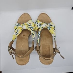 Comfy wedge sandals with padded fabric insoles. Uppers are white fabric with a yellow and green lemon print. Cork wedge, with synthetic sole. Heel is approximately 3.75", with a 5/8" platform under the ball of the foot.