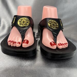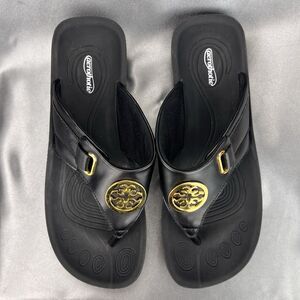 Aerothotic Sandals Womens 9.5 /40 Arch Support Glynis Flip Flop Black / Gold Medallion Summer Vacation Travel Comfort Shoes