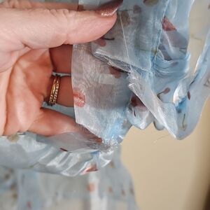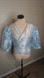 Elevate your style with this sheer blue wrap top. Perfect for any occasion, this top offers a chic and elegant look. Aeryne Agathe Top Large Feuille Blue Sheer Organza Puff Sleeve Wrap Top , beautiful wrap tie blouse with print and puff sleeves, FLAW the arm cuffs are both split at the seam.