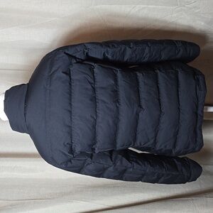Stay warm and stylish with this black down puffer jacket. Full zip front with snap neck collar. Front zip pockets. Excellent condition.
