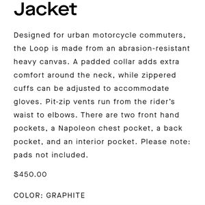 https://aetherapparel.com/products/loop-motorcycle-jacket-graphite?variant=40398111244371¤cy=USD&utm_source=google&utm_medium=cpc&utm_campaign=google+shopping&gad=1&gclid=CjwKCAjw5remBhBiEiwAxL2M9-lSNz2p7_mI_ljCNgfqnmYKTM8tT5dcCfUHykohV9rG_gsbNZBidBoC9ooQAvD_BwE&gclsrc=aw.ds