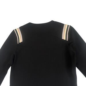 Features a modern black crewneck pullover design with signature stripe accents on both shoulders for a sleek, athletic-inspired look.