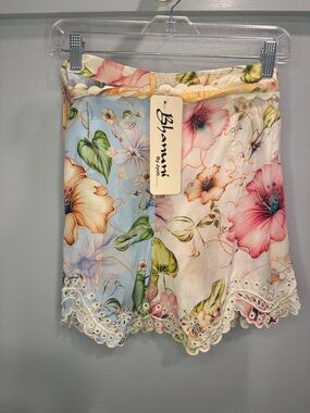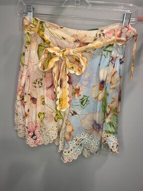 Soft pastel floral short with eyelet scallop trim. Peach and powder blue background with multicolor hibiscus print. Lightweight, breezy fabric perfect for warm days.