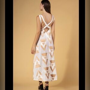 Step out in style with this elegant white and tan geometric dress. Perfect for any occasion, this dress combines comfort and fashion effortlessly.