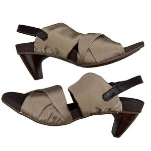 tan heeled sandals, crisscross sandals, open toe shoes, aetrex sandals, slingback heels, elastic strap shoes, women's block heels, casual sandals, padded insole shoes, size 9W women's shoes, comfortable heels, stylish tan footwear, versatile heeled sandals