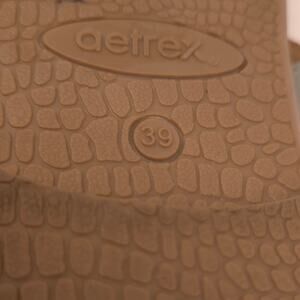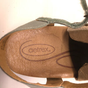 Aetrex Sage Green Leather T-Strap Flat Sandal, Sunburst Dark Brass Trim-Size 8.5
