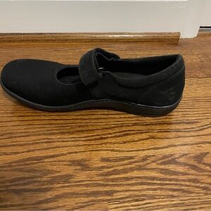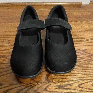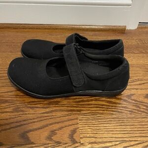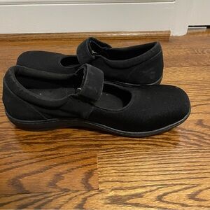 These are women's Aetrex black, mary jane style slip on shoes with a velcro strap across the top of the foot. The straps show some wear but they are still in good condition. The shoes are a size 10.