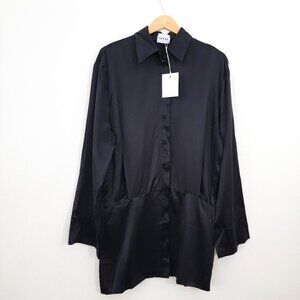 A new take on the shirt dress. Cut and double lined in a thick luxurious silk, featuring a silk button placket, tailored waistline and oversized bell sleeves. Designed to wear as a mini dress for an elevated evening look.