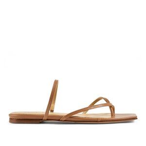 Made in Italy from buttery leather in a versatile light-tan hue the brand calls 'Hazelnut', this pair has sleek square toes and thin crossover straps that frame and flatter the foot. A couple scuffs to leather, please see photos.