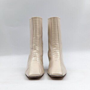 Step into sophisticated style with Aeyde Women Molly Paneled Smooth Ivory Leather Croc Print Ankle Boots. These boots are in new condition with no signs of wear on the soles and have never been worn. They feature a minor defect with a transfer of color on the side of the right boot. Made in Italy, model # Molly showcases a luxurious leather upper, leather lining, and leather soles for ultimate quality and comfort.
