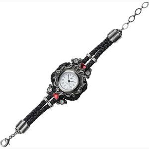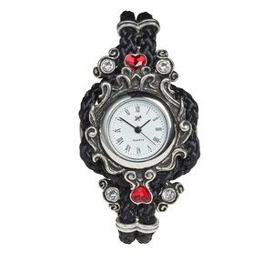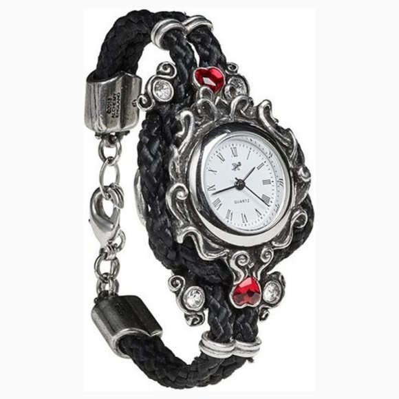 Rare & Retired Alchemy Gothic Affiance Wristwatch (AW29). An elaborate and delicate looking wrist watch with a black braid synthetic strap, interwoven with the polished pewter scroll-work frame which is studded with four clear and two red heart Austrian crystals. One size fits most, adjustable.