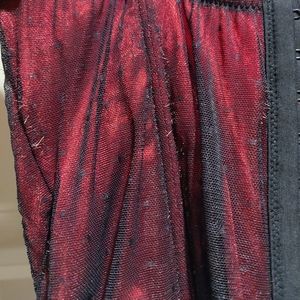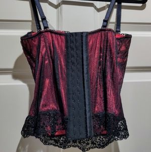 Affinitas Intimates corset with push-up passing and adjustable hook & eye on the back. There is some fraying on the elastic as pictured, but it's not very visible. Red is even brighter in person! Adjustable shoulder straps.