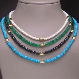 • Multi-strand design with cultured freshwater pearls, black spinel, emerald-colored chalcedony, blue magnesite gemstone beads, and goldtone-plated sterling silver stations; polished