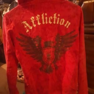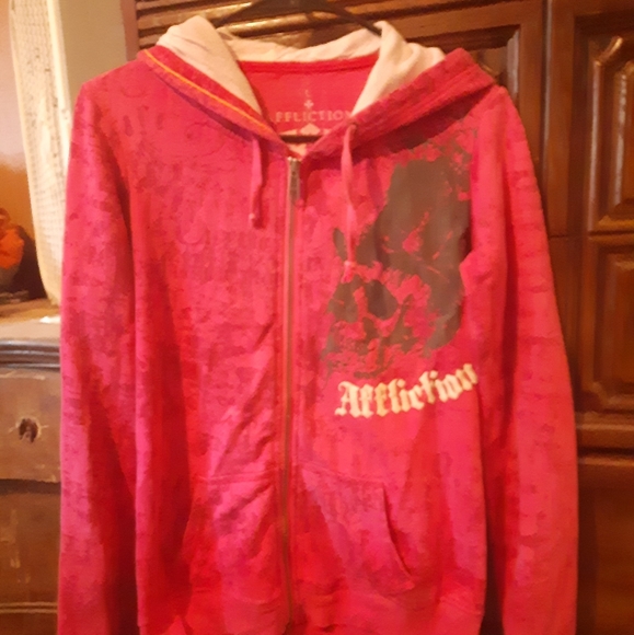 This is a pink affliction hoodie, it says that it is a large but fits like a medium.