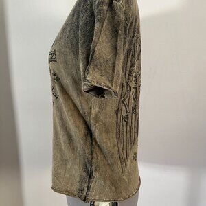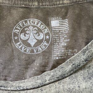 Affliction Battlefront Live Fast Iron Cross tee in size S. Fatigue green wash color in soft cotton knit. Cropped fit for the ladies. Great detail on the back. Wide neckline. Short sleeves with manufactured curled hems and distressed look. A few small pinholes on back of shirt shown in photos, normal for Affliction tees. All cotton, made in USA.