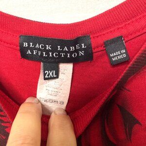 Tags: men's graphic tee, Affliction shirt, black label tee, 2XL skull shirt, tribal design shirt, red shirt, cotton tee, gothic style, bold graphic shirt, crew neck tee, men's large shirt, edgy design shirt, made in Mexico, Rhinestone, Rock, Grunge, Indian Skull, t-shirt, front and back hit, Native American Skull, Y2K, Tiger, Roses