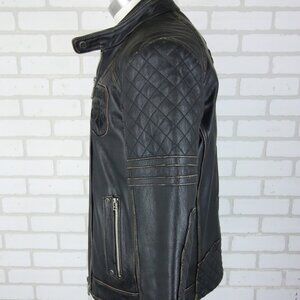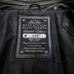 This is for a preowned Affliction Black Premium Limited Edition Leather Jacket in Mens L but fits slim. 100% Leather with some factory patina from Affliction. Lots of cool detail to this piece. Its a limited edition jacket which are numbered. Its in good condition and has been stored in my closet for years hasn't had many wears. As mentioned this fits slim also with a slight midbody taper so Please refer to the measurements.