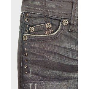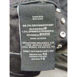 Elevate your denim game with these black Affliction Raquel skinny fit jeans. The cotton blend fabric with spandex offers both comfort and stretch for a perfect fit. The 5-pocket design with studded, rhinestone, embroidered, and logo accents make these jeans a statement piece.