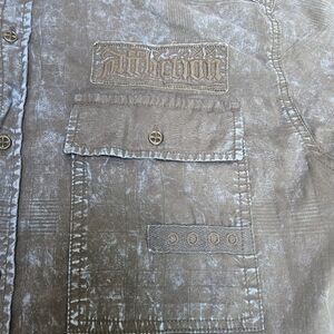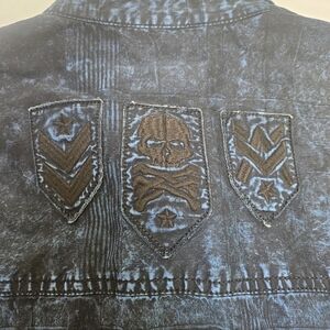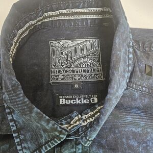 This Affliction Blue Studded men's button-down longsleeve XL is a stylish and edgy casual button-down shirt perfect for men looking to make a statement. The shirt features a button-down collar and long sleeves, making it versatile for both casual and semi-casual occasions. The studded accents add a touch of sophistication and unique style to the classic blue color, making it a standout piece in any wardrobe. Made for regular size men, this shirt is sure to become a go-to favorite for any fashionable individual.