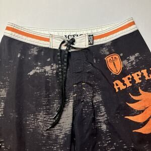 Affliction Board Shorts Black Orange Distressed Patches Swim Trunks Size 36