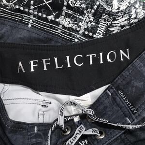 Item: Mens board shorts/swim trunks featuring tonal gothic script with a bold white side-panel graphic and cross applique; branded drawcord and interior AFFLICTION waistband.