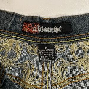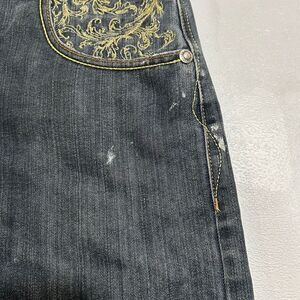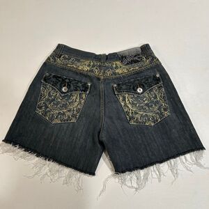 Affliction men’s denim shorts, size 34. Features signature gold baroque embroidery on pockets and waistband, frayed raw hems for a rugged look, and a faded black wash. Slight white marks on front (pictured) add to the distressed character. Heavy stitching and metal button details. Perfect for casual streetwear, concerts, or festival outfits.