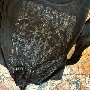 Affliction Live Fast Women’s Bodysuit Size XS Sheer Mesh Low Cut Black Moto