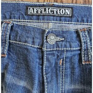 Affliction Men Jeans 38 Blue Denim Ace Distressed Straight Pockets. The jeans are in great condition. Please note pictures for condition and measurements