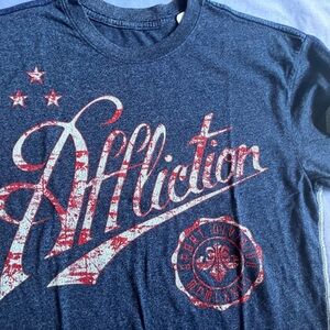 Bold Affliction graphic on dark blue. Red accents add flair. Perfect for casual wear.