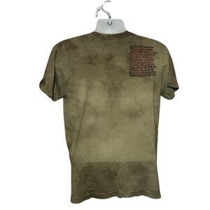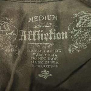 This Affliction t-shirt features a skull graphic tie-dye on both sides. The short sleeve tee is made of comfortable cotton knit material and has a crew neck. The shirt is designed for regular fit and is available in size medium. The t-shirt is perfect for all seasons and is easy to care for. It is a great addition to the wardrobe of any warrior or skull-themed enthusiast. The shirt is not vintage and is from the Affliction brand.
