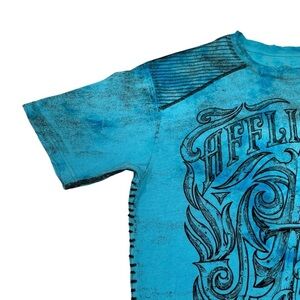 Elevate your style with this Affliction men’s tee in electric blue. Made from thick, high-quality material, this shirt features a gothic-inspired design with intricate detailing. The distressed wash and stitched details add to its rugged look. There is a small bleach spot on the back, as pictured.