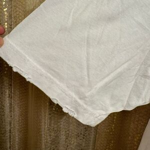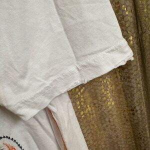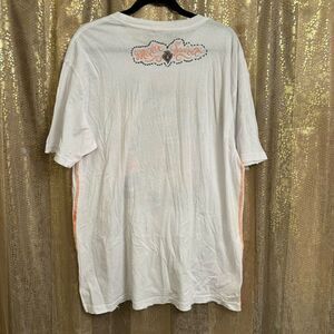 Excellent condition for the most part. a little smudge of dirt on the bottom back (See photo 8) and it will come out in the wash. Smoke and pet free home. Orange, White and Gray embroidered designs on the front and back. Intentional distressing around the arm and neck holes. Mens size 2XL. 100% Cotton. Soft and stretchy feeling cotton.