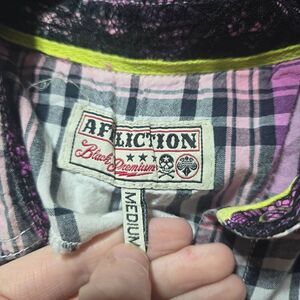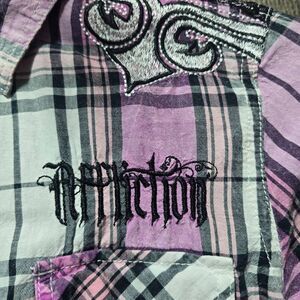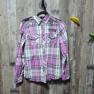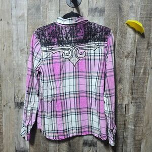 Affliction Pink Plaid Acid Wash Embroidered Rhinestone Snap Button Down Shirt