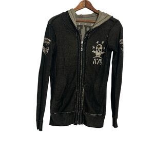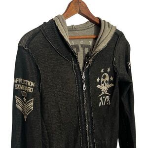 Affliction Reversible Distressed Graphic Grunge Zip Up Hoodie Black Tan Size XS