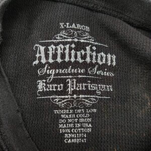 Back details: "Affliction" and "Karo Parisyan" across the upper back