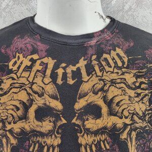Front details: Large mirrored skull artwork with fleur-de-lis; "Affliction" across chest and "The Heat" near hem