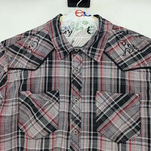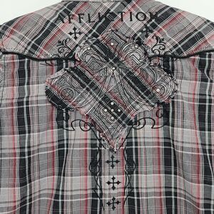 Affliction Shirt Mens XL Black Red Gray Plaid Western Embroidered Cross