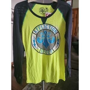 Affliction Sport Long Sleeve Mesh Tee in small size and new condition. This yellow biker MMA T-shirt features a regular fit and pullover closure, making it easy to wear for any casual occasion. The thermal and tagless features provide added comfort, while the machine washable fabric makes it easy to care for. Perfect for all seasons, this T-shirt is a great addition to any wardrobe.