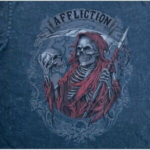 Affliction Vtg Y2K Mens XL Reaper Distressed Destroyed t Shirt Grunge skull, blue distressed