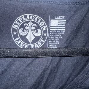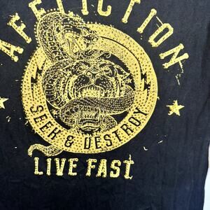Stand out in true Affliction style with this black and yellow studded v-neck tee. Featuring the iconic Live Fast graphic, rhinestone/stud accents, and 3/4 sleeves, this shirt brings the bold edge the brand is known for.