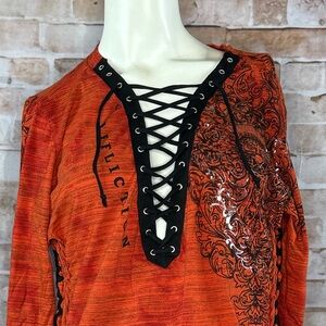 Affliction Women’s Graphic Long Sleeve Lace Up Top -Size: Large -NWT