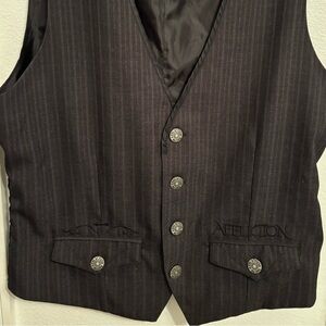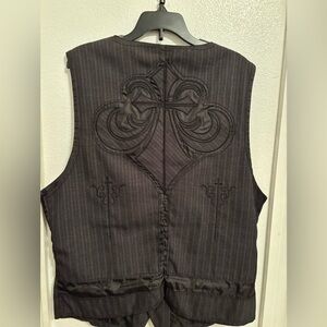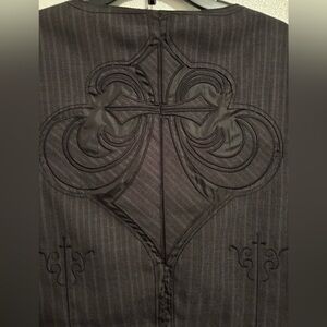 I believe this is vintage or close to it. Great condition dark charcoal pinstriped vest with embroidered accents. Rare find. Great statement piece!