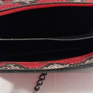 Chic snake print design. Bold red and gray colors. Elegant chain strap detail.