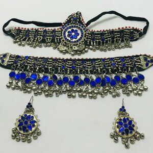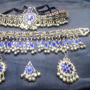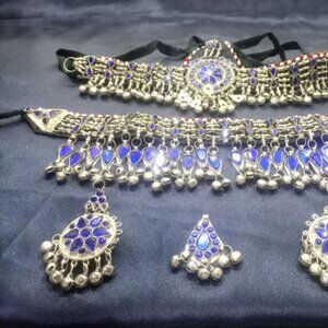 Afghan Blue Glass Stones Jewelry Set, Four Piece Kuchi Afghan Jewelry Set