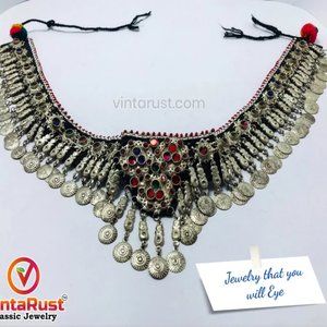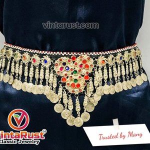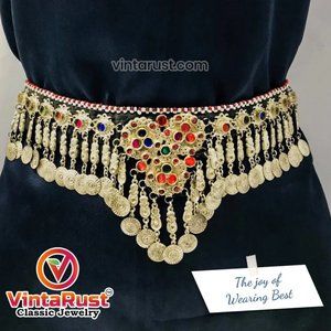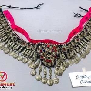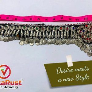 • This vintage-inspired tribal belt can also be worn as a statement choker necklace as well because of its soft fabric it will fit elegantly around your neck. It has been created to carry the gypsy passion with a collection of tribal ornaments.