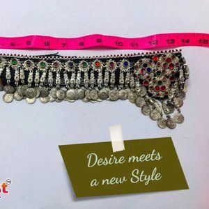 • This tantalizing tribal belt is well recognised around the globe for vibrancy and ethical design. This tribal belt is highly embellished with multihued glass stones, tribal coins, rhythmic bells and the nicest quality of fabric which add ethnic appeal to this tribal piece.
