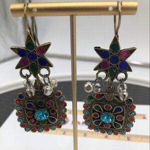 Afghan Oversized Dangle Earrings With Multicolor Glass Stones, Afghan Earrings