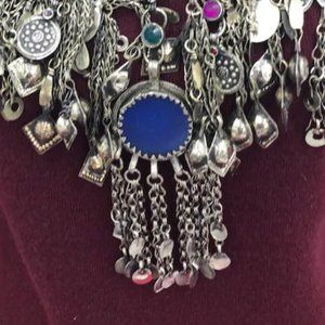 This Afghan massive tribal necklace is a majestically handcrafted piece Every tassel of this tribal piece is embellished with glass stones of different colors and metallic coins. Made with fine quality materials and flawless glass stones this massive tribal jewelry piece carries an antique pendant with a huge blue glass stone inland on it. It is giving full traditional vibes to this tribal piece.