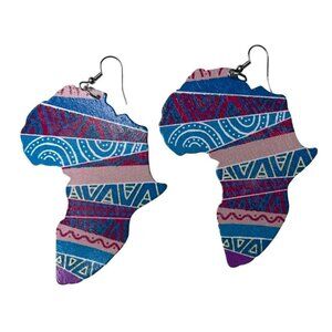 Embrace your boho style with these Africa Shaped Wood Earrings. They feature vibrant tribal patterns in purple, blue, and pink hues, offering a 90s Y2K vibe. Statement earrings with fishhook backs, perfect for women who love bold accessories.