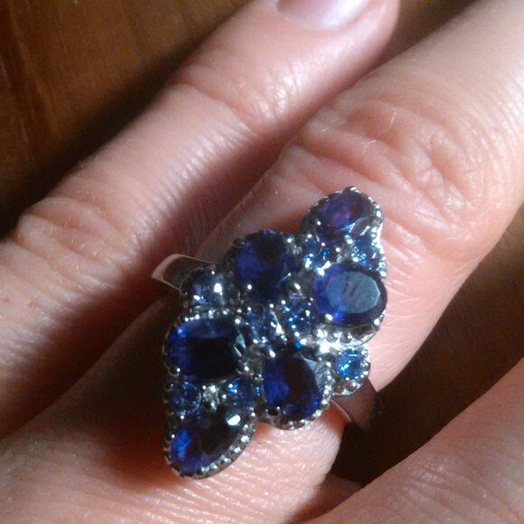 This multi-stone design ring features the gemstone African amethyst and simulated purple diamond accents. The ring is size 6 and is set in stainless steel. 2.35 ctw. Brand new.
